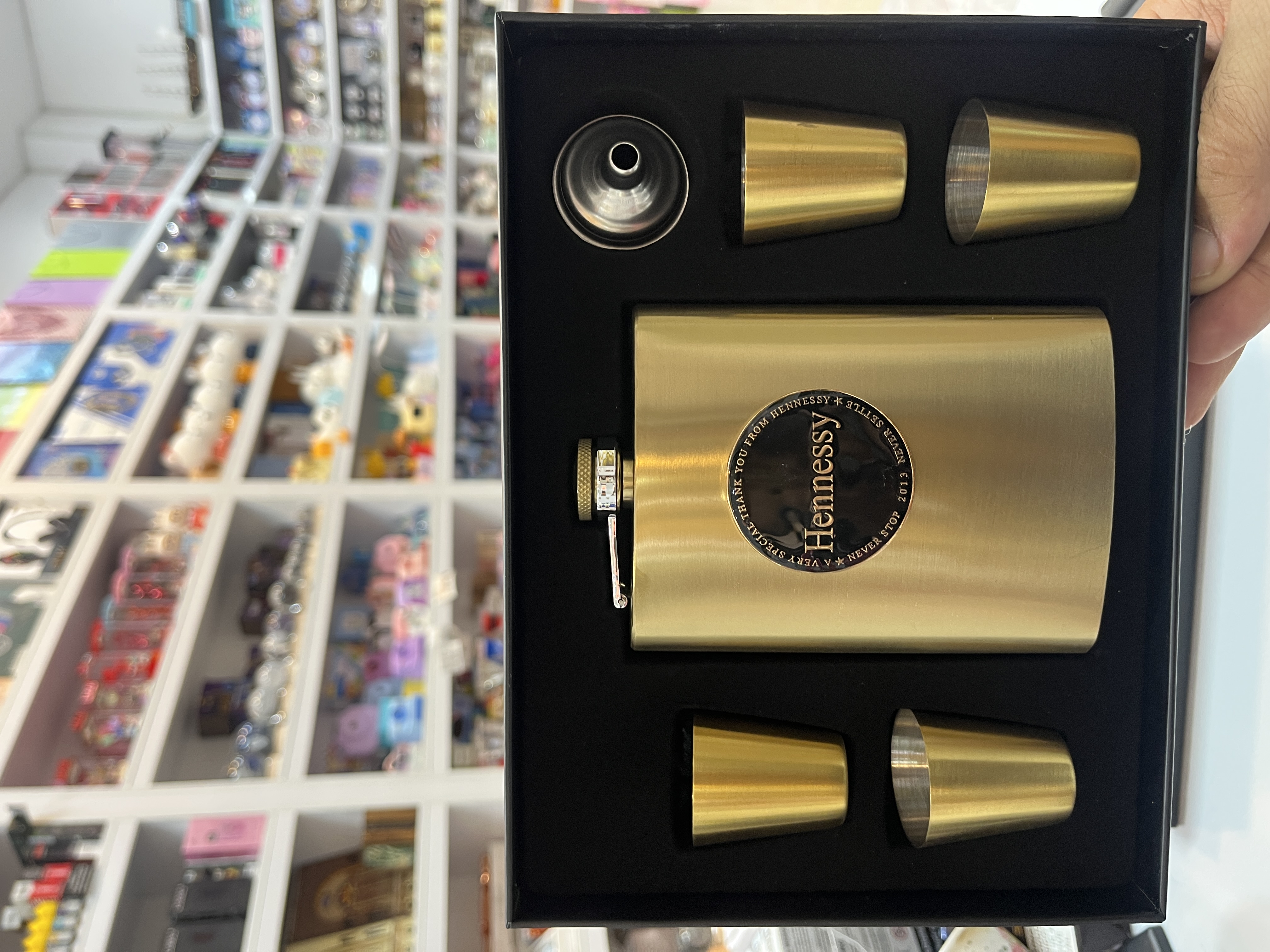 ست قمقه جیبی استیل با فندک فلزی و زیر سیگاری و جعبه چوبی شطرنج