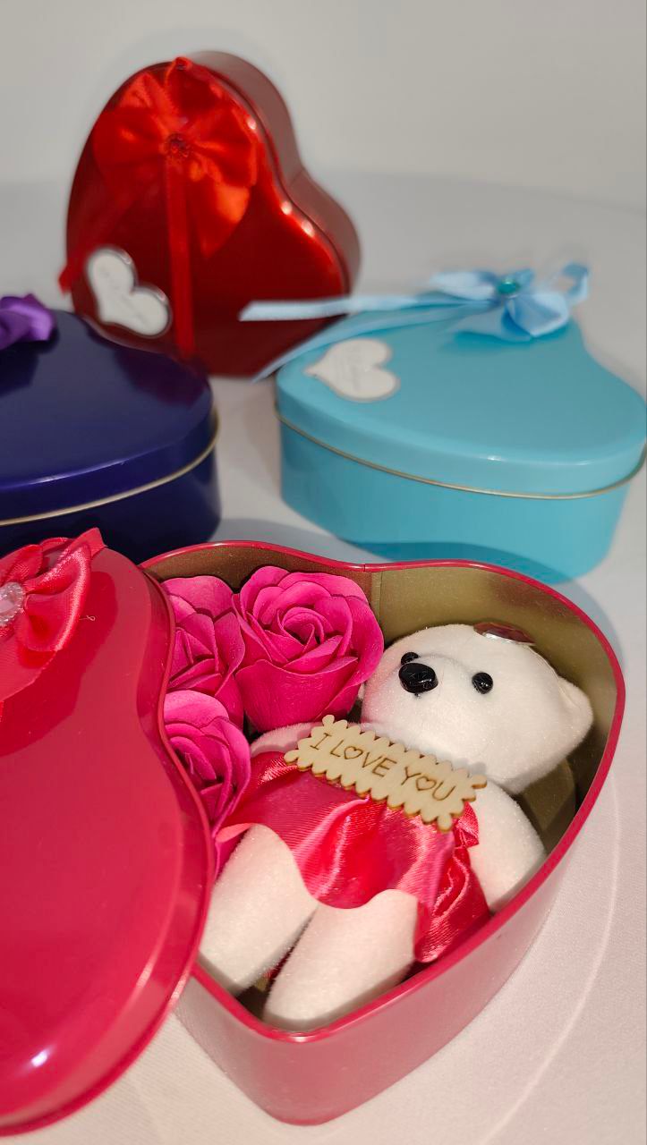 ست هدیه جعبه قلبی به همراه عروسک مدل خرس و گل سایز متوسط