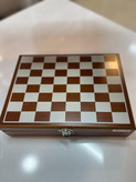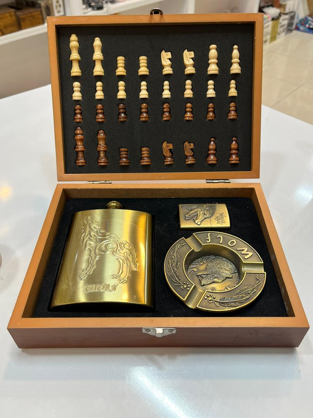 ست قمقه جیبی استیل با فندک فلزی و زیر سیگاری و جعبه چوبی شطرنج